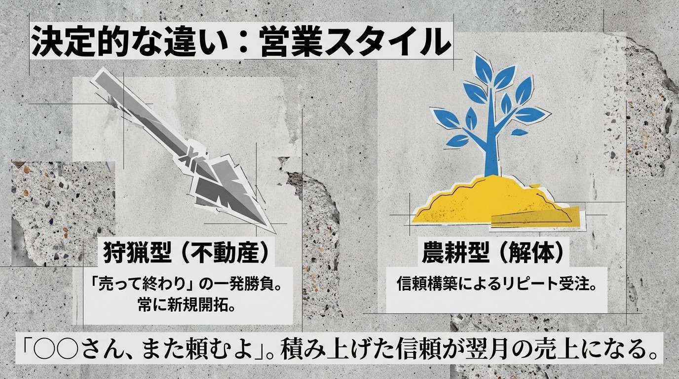 対して解体営業は、役目を終えた建物を安全に取り壊し、土地を更地に戻す「リセット」の仕事です。