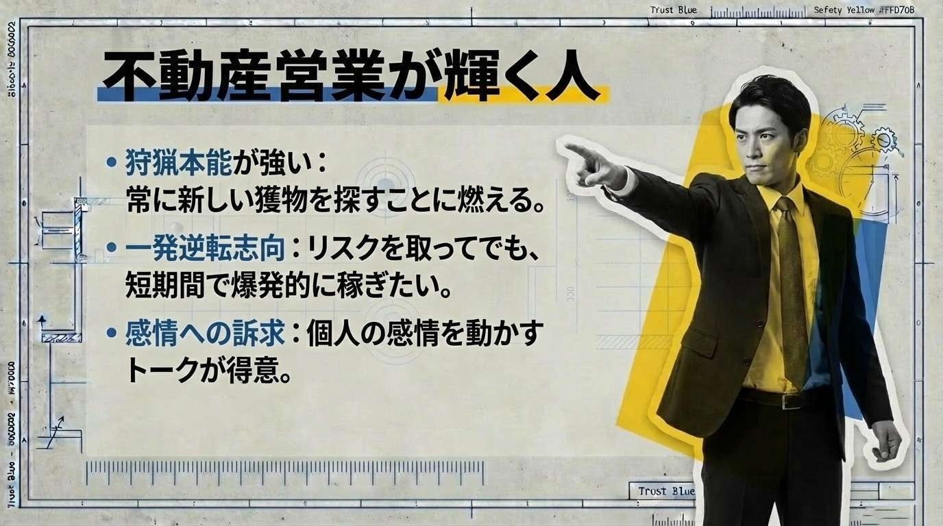 狩猟本能が強い:常に新しい獲物(顧客)を探し回ることに燃える。- 一発逆転を狙いたい:リスクを取ってでも、短期間で爆発的に稼ぎたい。
